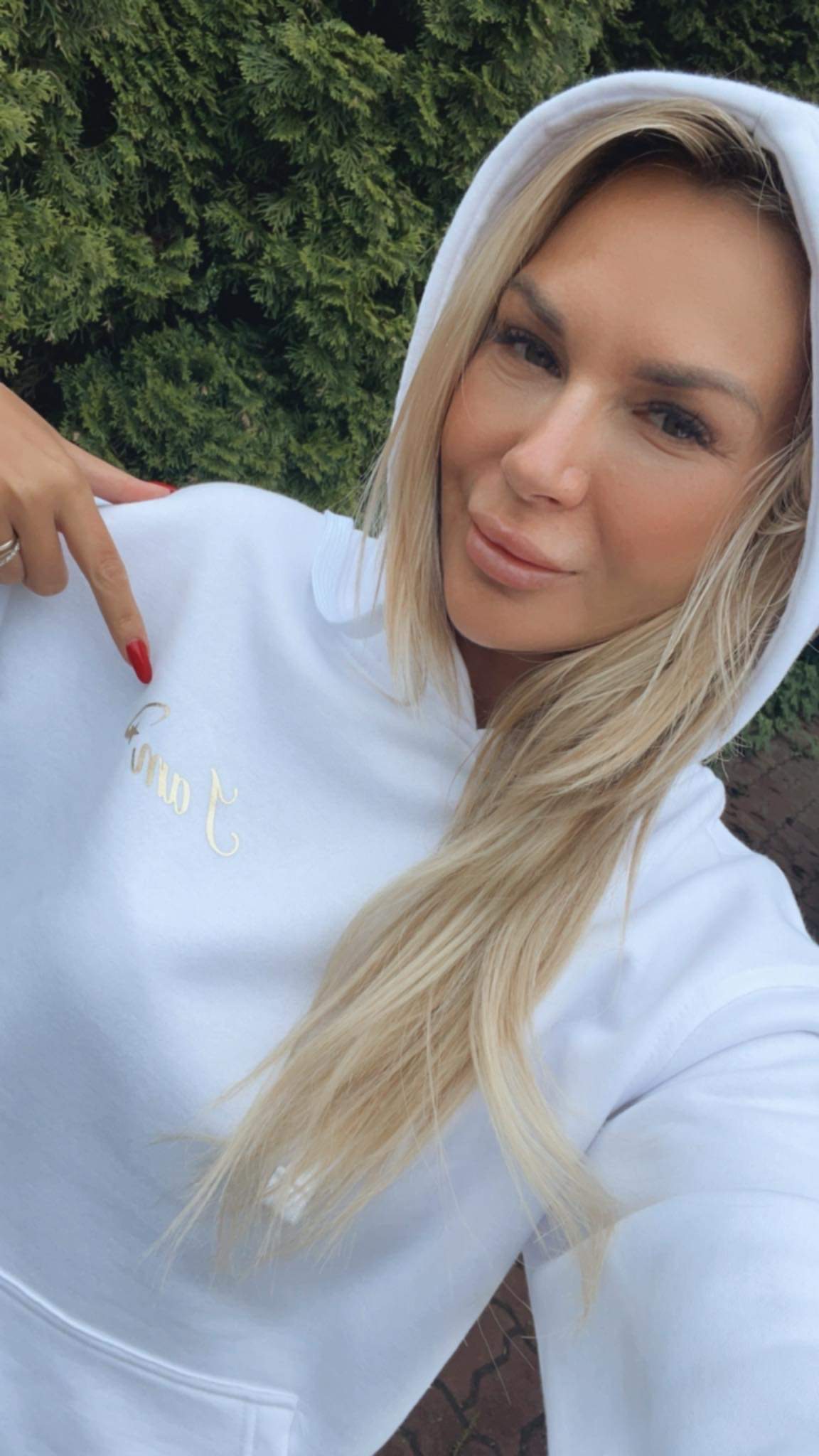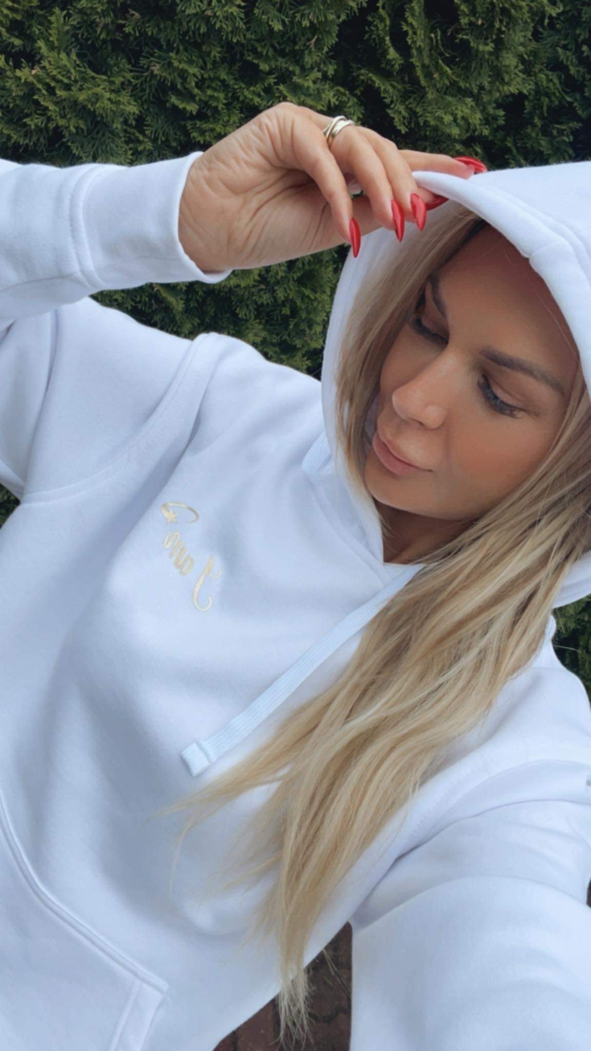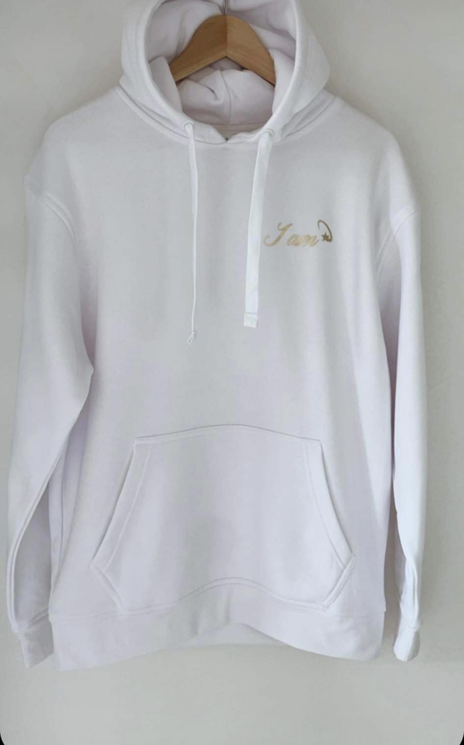 Bluza z kapturem o luźnym kroju, wykonana z przyjemnej w dotyku dzianiny bawełnianej. Model z regulowanym na troczki kapturem oraz długim rękawem, który zakończony został prążkowanym ściągaczem. Minimalistyczny, złoty napis “I am”.