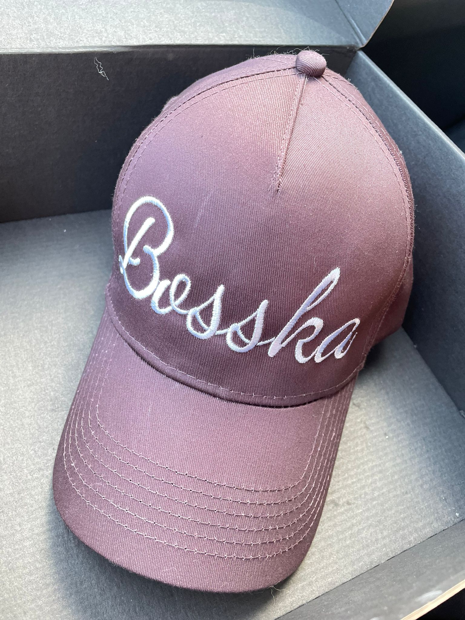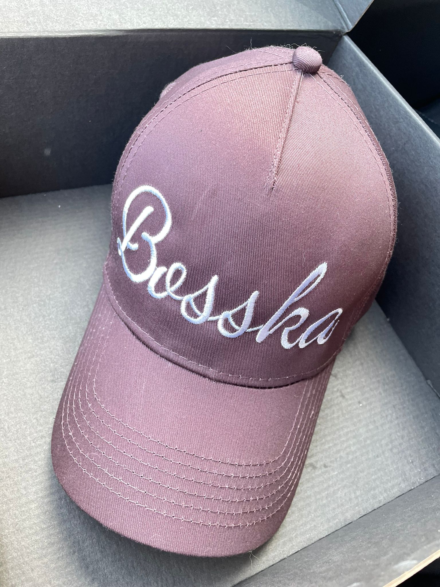 Czekoladowa bawełniana czapka z daszkiem, z wypukłym haftowanym napisem BOSSKA w kolorze białym.