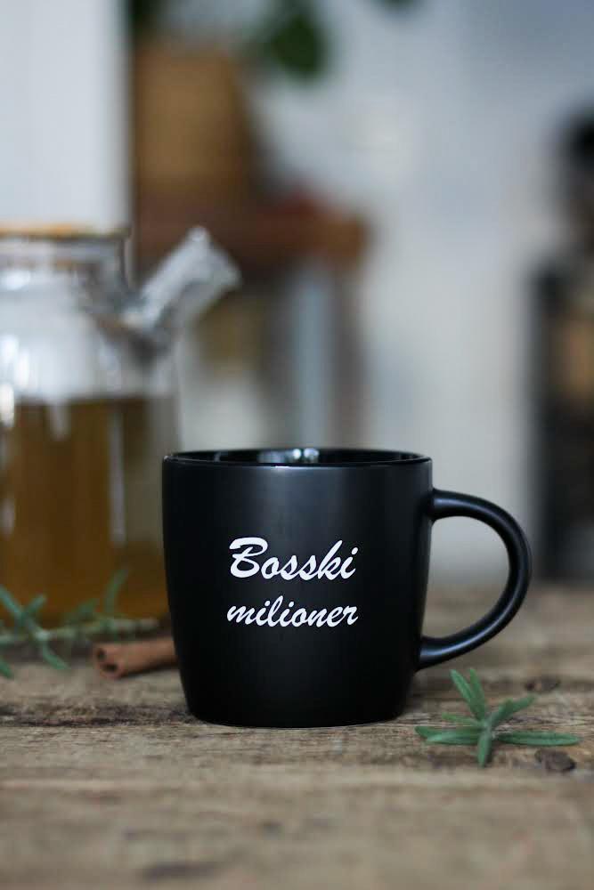 Czarny kubek z kontrastowym, białym napisem “Bosski Milioner”.